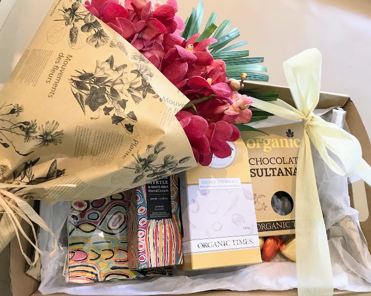 Gift Hamper with orchids of the day, organic choc sultanas, cookies, shea butter and goats milk hand cream, cotton pouch, heart chocs presented in a box $110