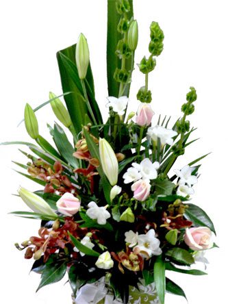 An expression of peace and soft serenity. Light pink roses, oriental lilies, exotic orchids and freesias are accented with the bright green stems of mollucca balm and a gorgeous assortment of lush greens