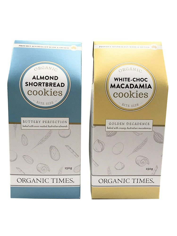 Proudly Australian Made & Owned Organic Times organic cookies. Almond Shortbread Cookie or White-Choc Macadamia Cookie 150gm