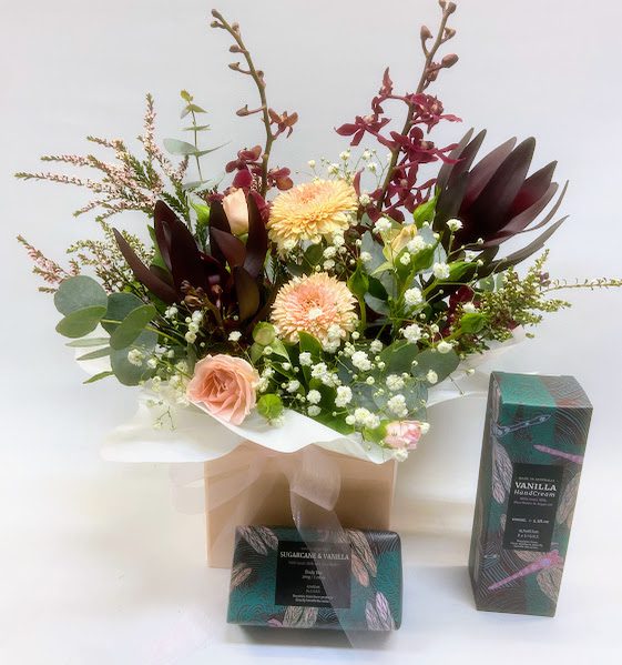 Flowers selected by the florist with soap and hand cream to compliment them