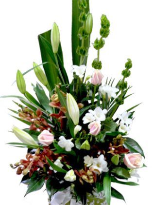 Arrangement of seasonal flowers, lilies and roses bloom