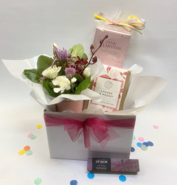 Bright blooms in a pot. with pink almonds, soy wax candle and lip balm gifted in a box