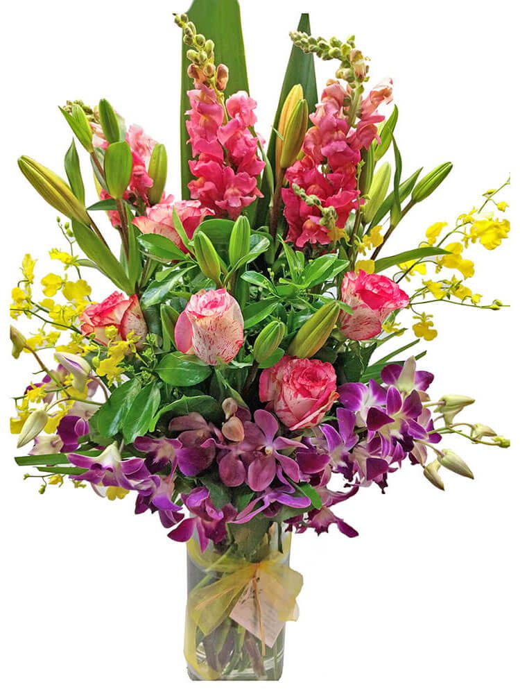 Happy and cheerful big flower vase arrangement of seasonal bright blooms