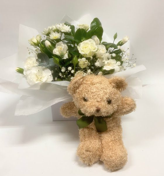 Seasonal white flower box with Teddy bear