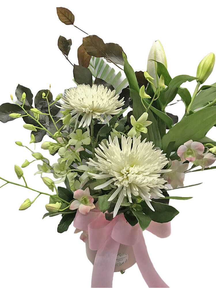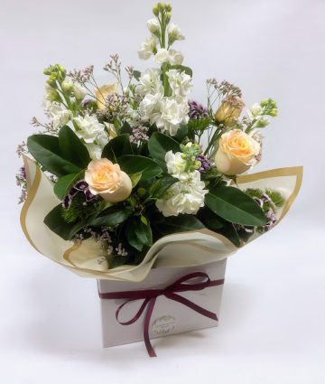 Beautiful and fresh flower arrangement of white and pink blooms in a box.