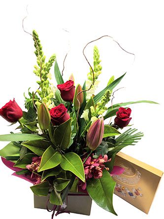 Box arrangement of roses, snapdragons, lilies and box of chocolates are just the perfect gift for the one you cherish.